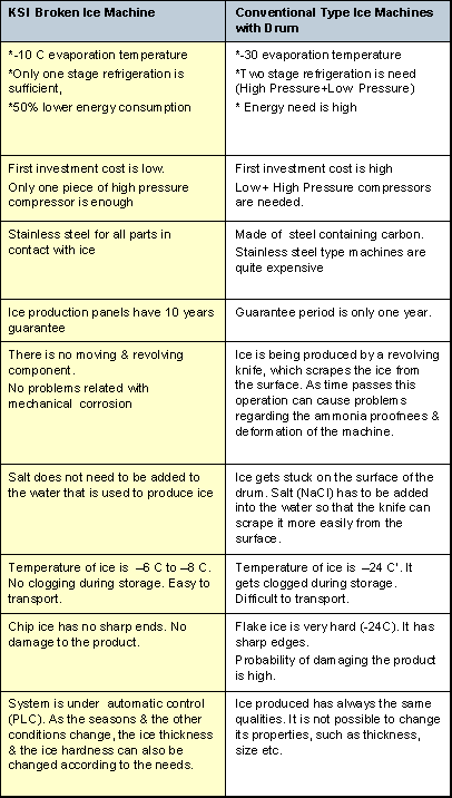 Conventional ice machines require two staged refrigiretion systems and they operate at –30C, -35C evaporation temperatures. However, for the KSI broken ice machines only one staged refrigeration system is sufficient because they work at –8C, -10C or –12C evaporation temperatures due to their high heat conduction coeeficient.