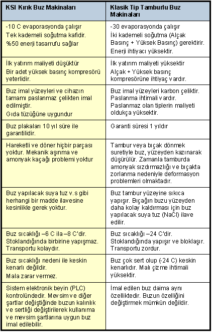 KSI kırık buz makineleri ile klasik tip tamburlu buz makinelerinin karşılaştırılmasına dair tabloyu aşağıda görebilirsiniz.